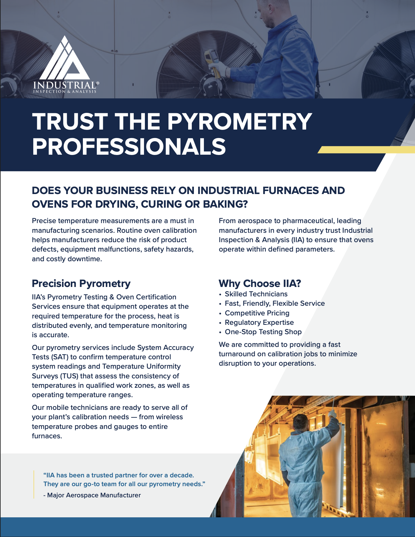 That’s why leading manufacturers in the aerospace, medical, food service and other industries turn to Industrial Inspection & Analysis (IIA) for precision measurement of high temperatures. These measurements are then used to confirm that ovens are operating within defined parameters.